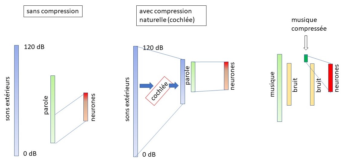 A gauche, on voit qu'en l'absence de toute compression de dynamique d'intensité, la dynamique des sons naturels, même légèrement réduite si on ne considère que la parole, est plus grande que celle des neurones, qui au maximum de leur dynamique, sont saturés. Au milieu, la compression naturelle introduite par la cochlée réduit l'amplitude de la dynamique que les neurones doivent encoder et la rend compatible avec les performances neuronales. Si la cochlée perd sa compression physiologique, celle-ci peut être remplacée par celle d'audioprothèses ou d'implants cochléaires. La surcompression électronique utilisée pour la musique, elle, ne vise pas à respecter la dynamique naturelle en la réduisant, mais à faire passer la dynamique de la musique au-dessus de tout bruit interférant. Le résultat fait fonctionner les neurones systématiquement au maximum de leurs possibilités, sans aucune pause réparatrice.