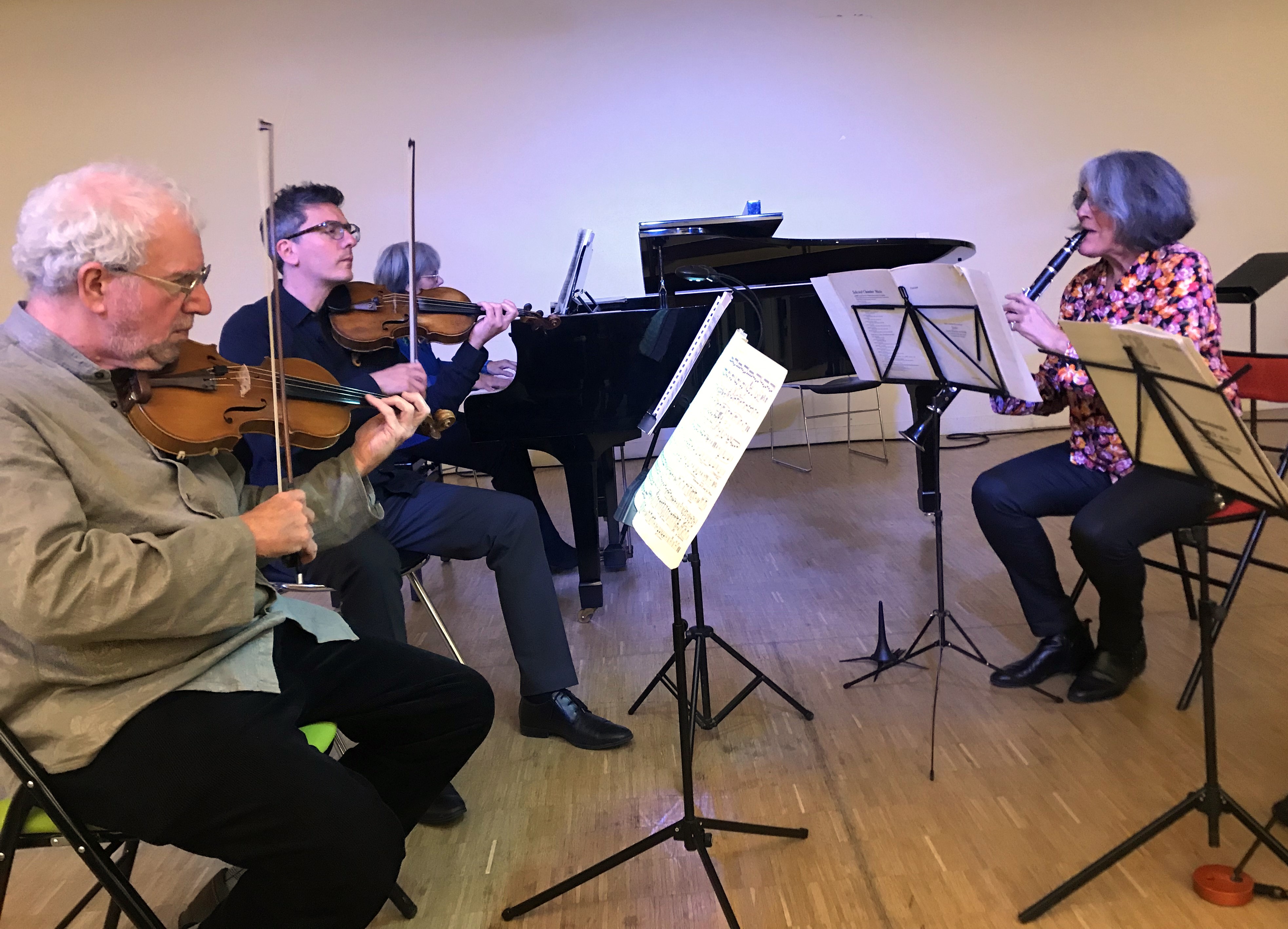 | Les violons et le violoncelle passent de gestes retenus où l’archet tapote à plat les cordes, à de grands coups d’archet amples voire violents, la clarinette apporte son extraordinaire tessiture, alternant sons chauds ou brillants, le piano est très solide, sait se retenir ou s’emballer, omni présent, nous avons la chance d’écouter des musiciens de grande qualité qui savent aussi bien nous plonger dans une ambiance poétique que nous faire entendre des sonorités très sombres. |