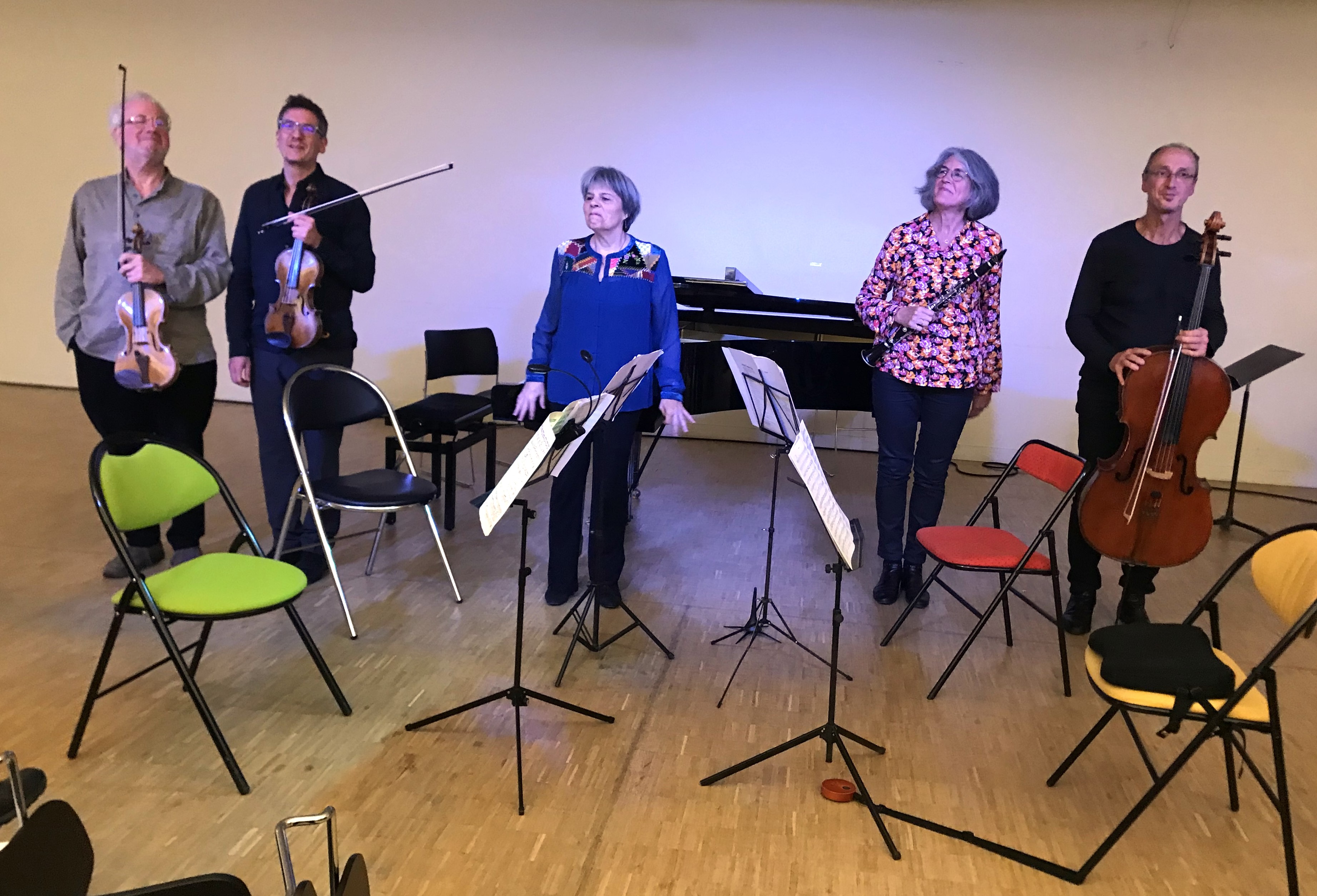 Puis le Tapis Vert au complet nous joue le troisième mouvement (Scherzo) du quintette avec piano opus 34 en fa mineur de Johannes Brahms, écrit en 1864 nous dit Anne, qui nous précise que la partie alto est tenue par la clarinette ; et que la première version à deux pianos a été remplacée par une version à un seul piano sur les conseils de Clara Schumann.