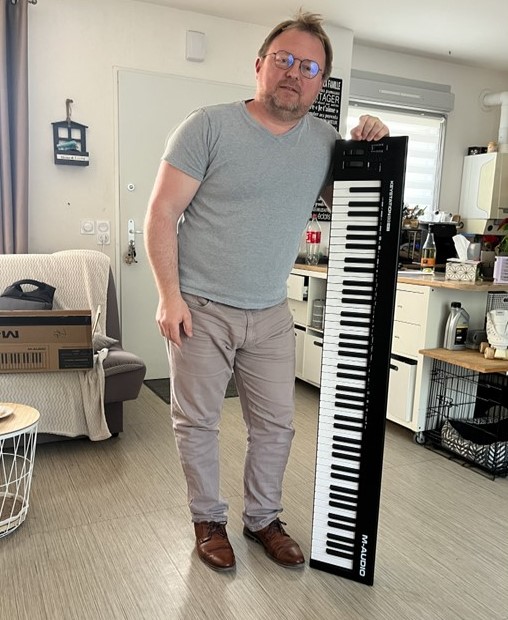 Puis je vais être implanté en 2021 et là commencera une réadaptation aux sons. D’abord, avec l’aide d’une orthophoniste j’apprendrai à reconnaître les sons parlés car il est essentiel de pouvoir converser avec le monde qui nous entoure. Lecture labiale et rééducation phonique. Puis forcément, je vais retenter de jouer de la musique car elle me manque tant ! Tout d’abord je constate que je perçois différemment les musiques que je connais des autres. Un morceau qui passe à la radio et que je n’avais jamais entendu avant d’être implanté est difficile à fredonner. Puis je découvre petit à petit que c’est possible de reconnaître des mélodies avec mon oreille implantée seule et ce, même si je ne les ai jamais entendues. En effet si je m’isole au maximum du bruit et écoute un morceau de musique que je n’ai jamais entendu auparavant, plusieurs facteurs vont me permettre de percevoir la mélodie de ce morceau de musique. Par exemple le type d’instrument va être un élément essentiel à ma bonne perception auditive. S’il s’agit d’un morceau de piano seul, il est plus facile pour moi de percevoir la mélodie. En revanche s’il y a plusieurs instruments, je vais devoir les dissocier un par un de l’ensemble pour analyser chaque mélodie et partie du morceau. Cette gymnastique ne peut se faire encore une fois que dans un environnement très calme car le moindre son extérieur empêche ma concentration et trouble donc ma perception auditive. Après avoir réussi à entendre et reconnaître les sons et donc la mélodie d’un morceau, à chaque fois que je l’entends, je réussi de mieux en mieux à le reconnaître et ainsi, l’apprécier ou non, mais cela reste difficile malgré tout. Alors je privilégie surtout l’écoute de morceaux connus pour parfaire ma rééducation musicale et lorsque j’écoute un nouveau morceau c’est à force de l’écouter que je finis par percevoir toutes les fréquences et en les mettant bout à bout je parviens à reconstituer tout le morceau, toute la mélodie.