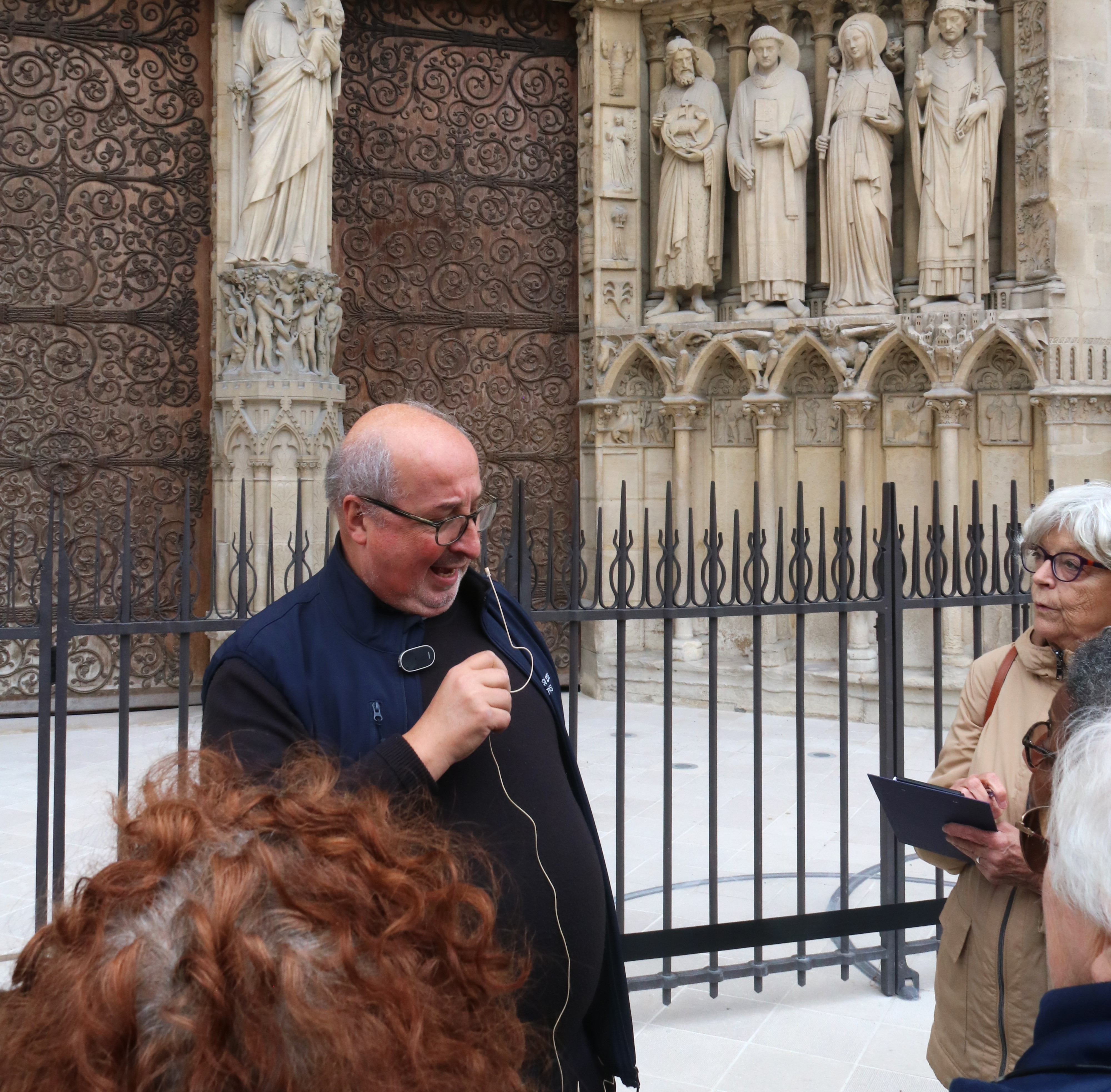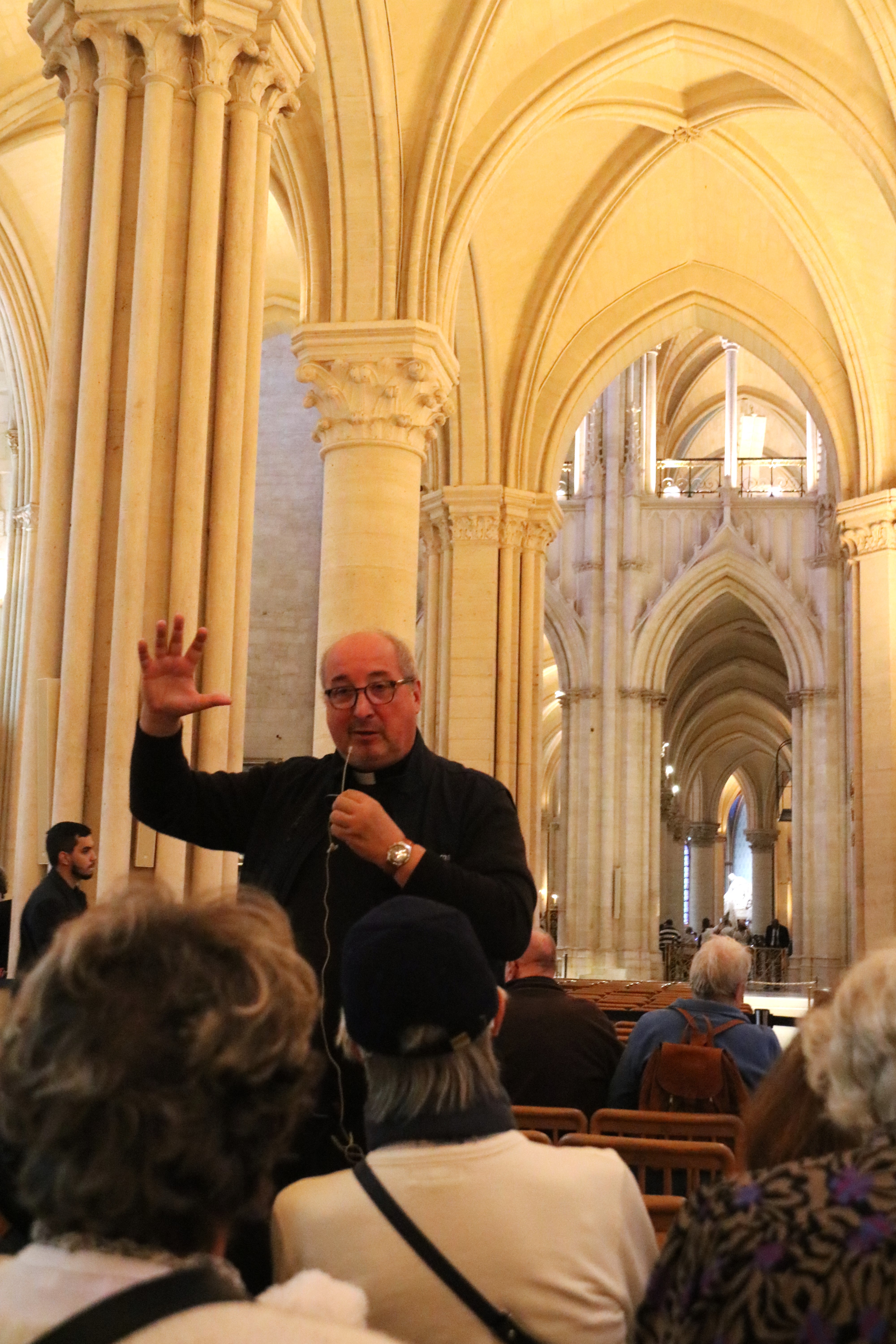 | Avec cette proposition de visite, Solange a rencontré un franc succès, et reçu de nombreuses demandes. Nous étions 19 inscrits, accueillis au portail Nord par le frère Bertrand, l’un des dix chapelains de la cathédrale, ce qui impliquait que nous aurions droit à une visite protocolaire (à l’instar des grands de ce monde et des têtes couronnées) ! |