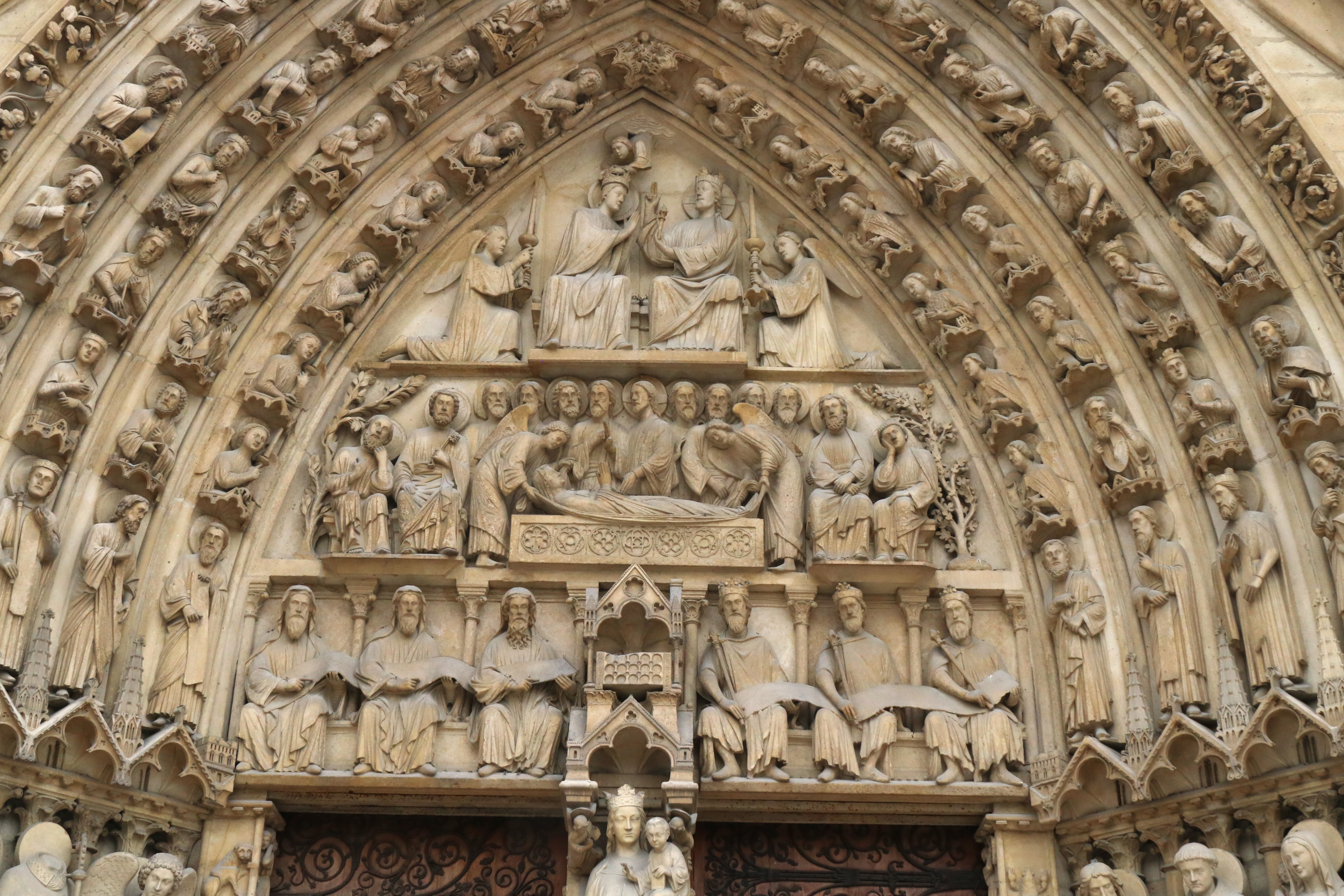 Il nous décrit ensuite les sculptures du portail de la Vierge : Des trois séries de 14 rois de la Bible, Notre-Dame n’en a gardé que deux, donc 28 monarques bibliques, auxquels la Révolution, focalisée sur le mot « roi » a coupé la tête. |