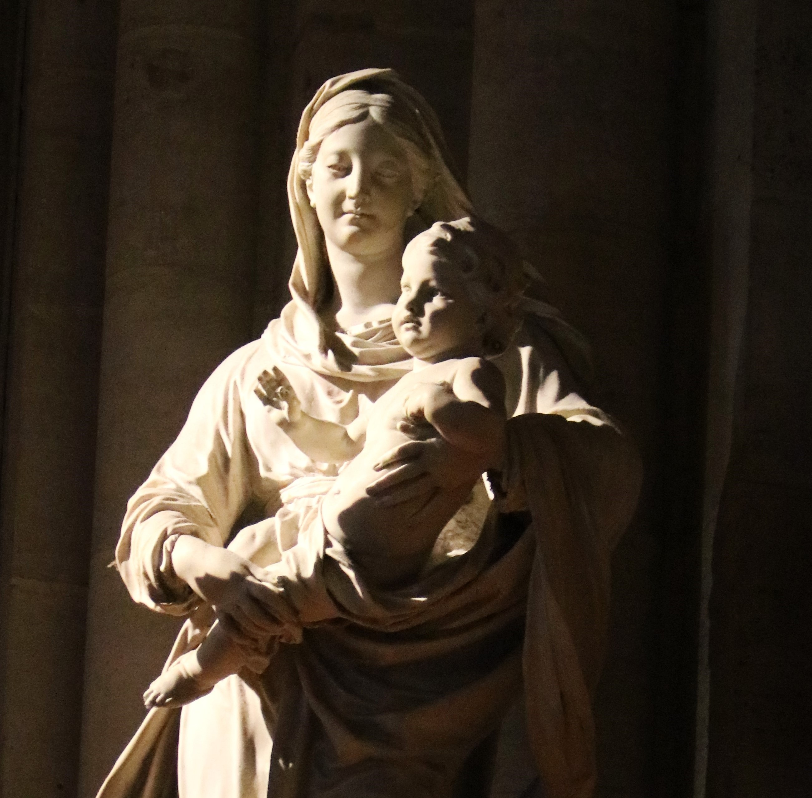 | Sur le premier pilier gauche, la statue de Notre-Dame des étudiants réalisée en 1722 par Antoine Vassé, et dont notre guide adore le gentil sourire. |