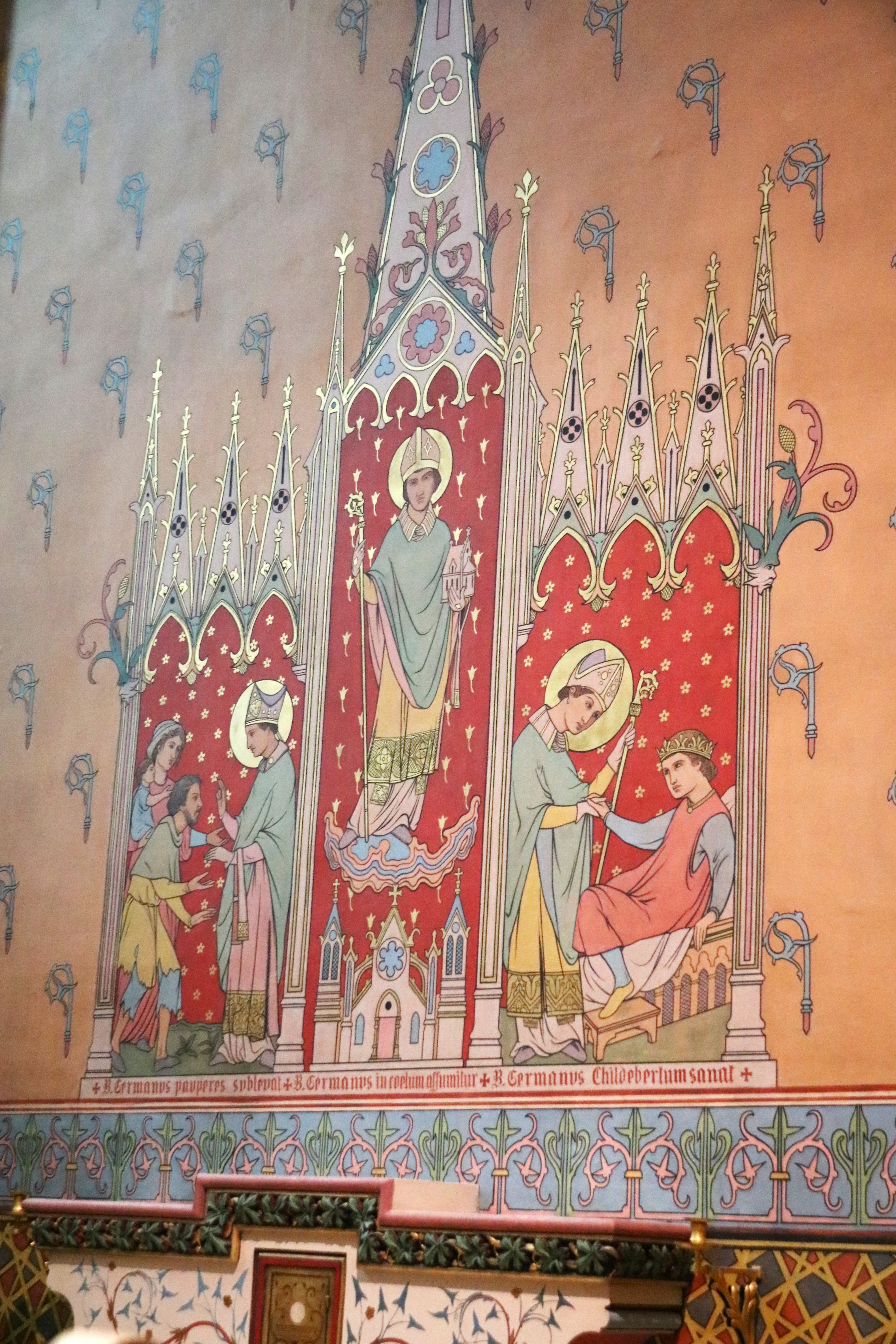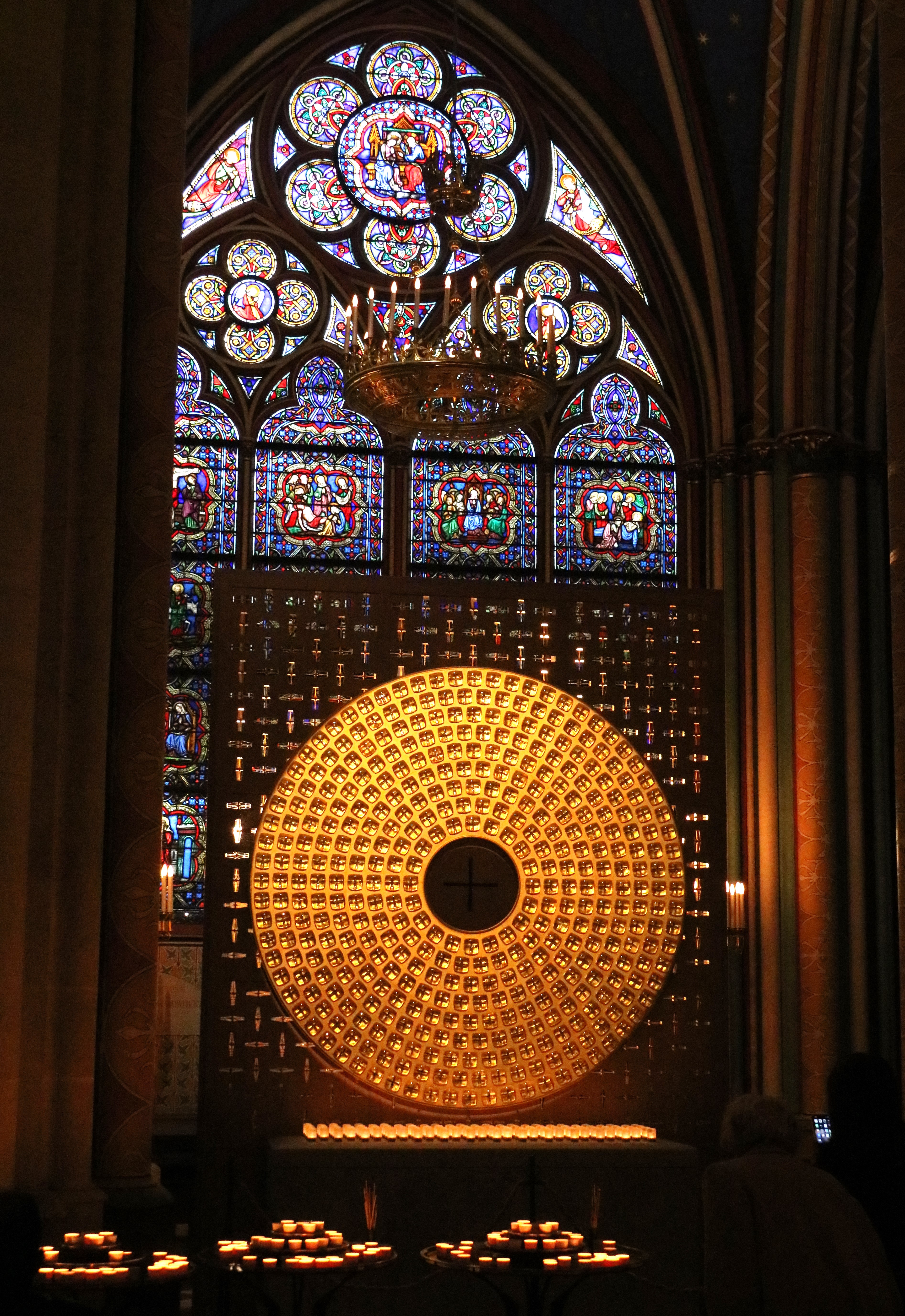 Du plomb a coulé partout, une goutte est tombée dans la main du Christ et ils l’y ont laissée, seule trace de l’incendie. Tout est clair et lumineux sur les trois étages. La restauration exceptionnelle a permis de nettoyer, outre les traces de l’incendie, la noirceur d’une pollution accumulée depuis un siècle et demi (précédente restauration).