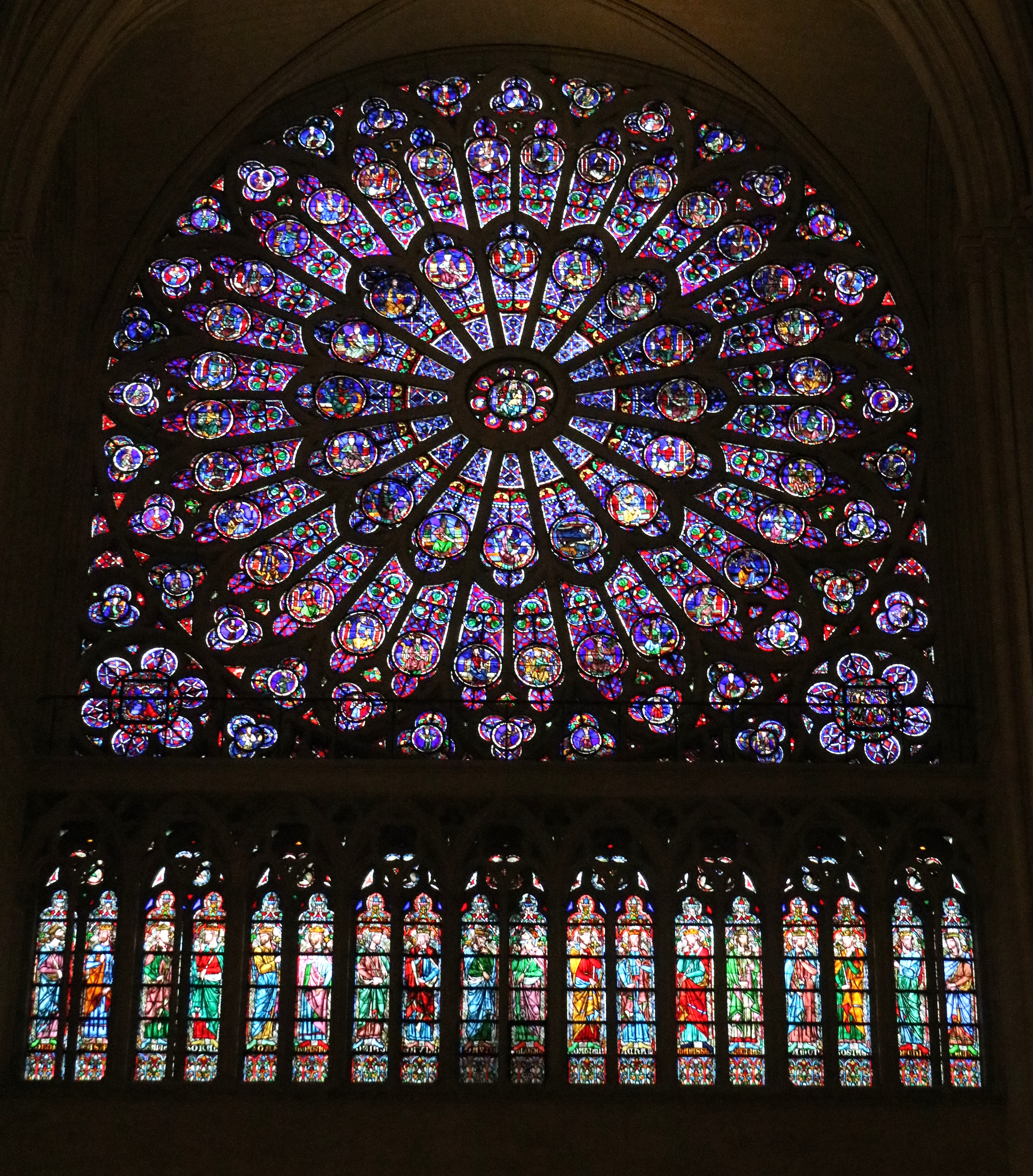 Les rosaces du transept sont de véritables joyaux. La disposition des quartiers sur la base de pierres étaient faites pour donner à l’œil l’impression de les voir tourner. Mais la rosace Sud ayant donné des signes de fragilité, on l’a fait pivoter pour la solidifier, elle repose désormais non sur un quartier mais sur un axe en pierre vertical. Les vitraux du XIIIème sont d’origine. L’incendie n’a rien brûlé. C’est plutôt la tempête récente qui a fait des dégâts.