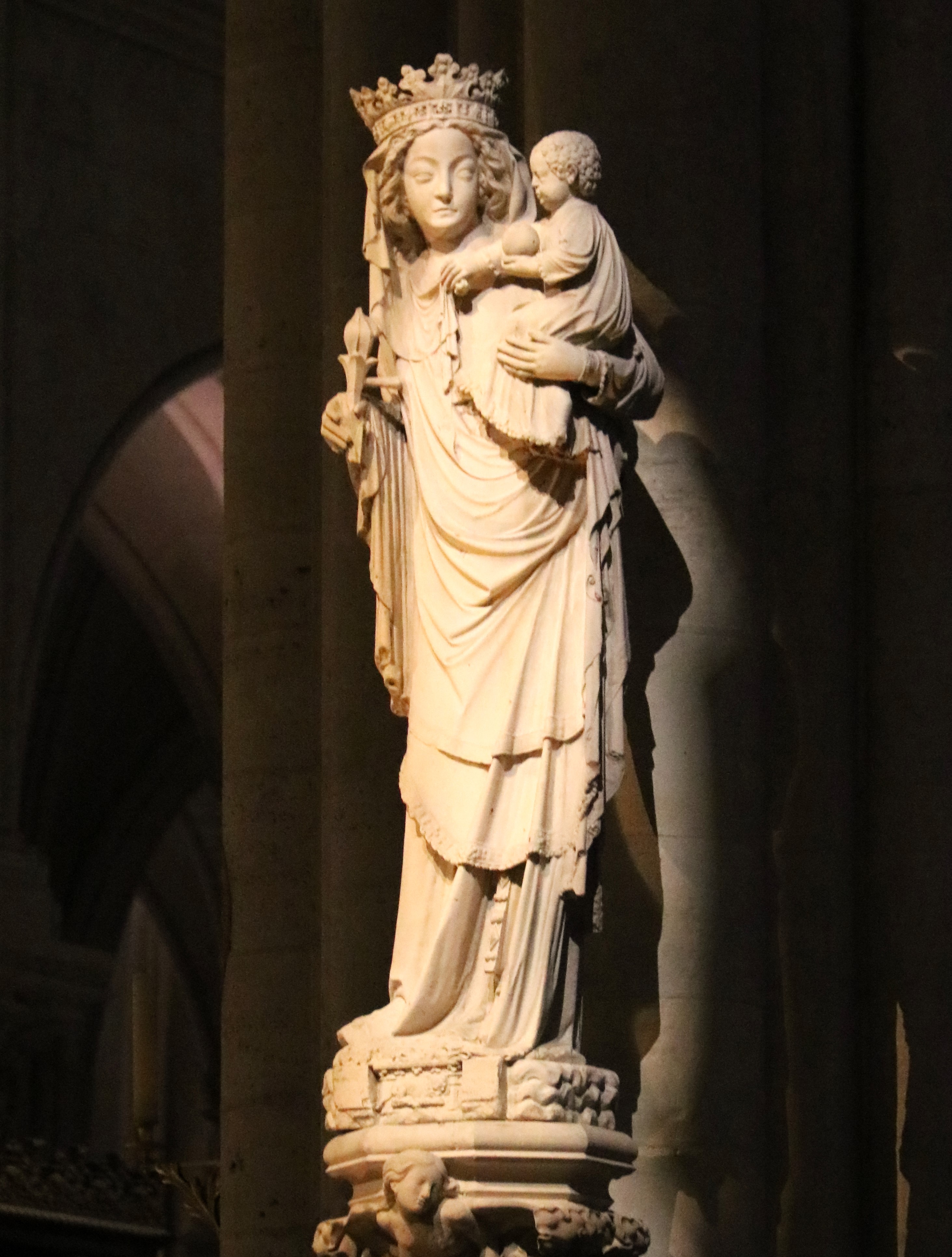 La statue dite Notre-Dame de Paris est connue dans le monde entier. C’est à ses pieds que Paul Claudel a rencontré la foi. Trouvée dans la chapelle Saint Aignan, elle date du XIVème siècle et a été installée dans la cathédrale au XVIIIème. Elle a été laissée intacte, de justesse (50 cm), par l’effondrement du toit.