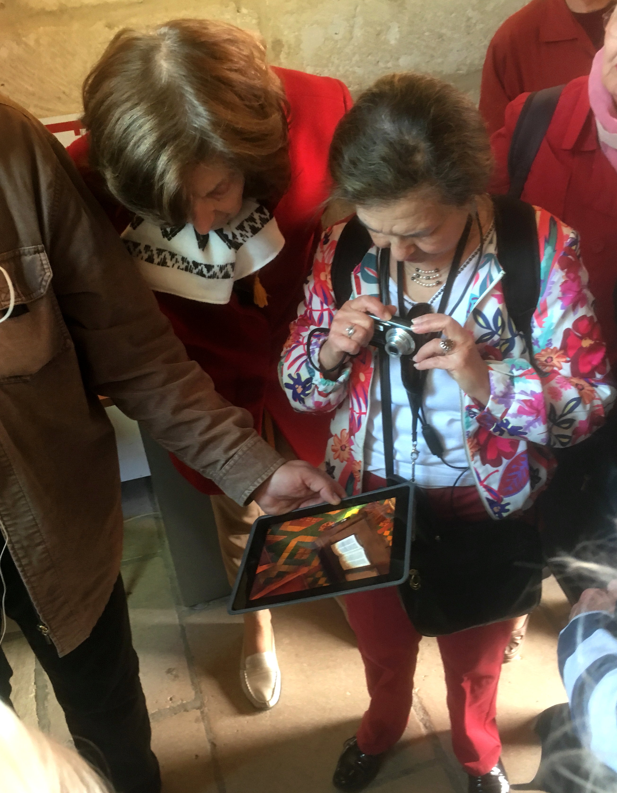 Au cours de la visite nous avons pu voir sur une tablette «en réalité augmentée» les peintures en couleurs d’époque et les boiseries qui couvraient les murs, ceci est un travail de recherche d’historiens et de scientifiques. |